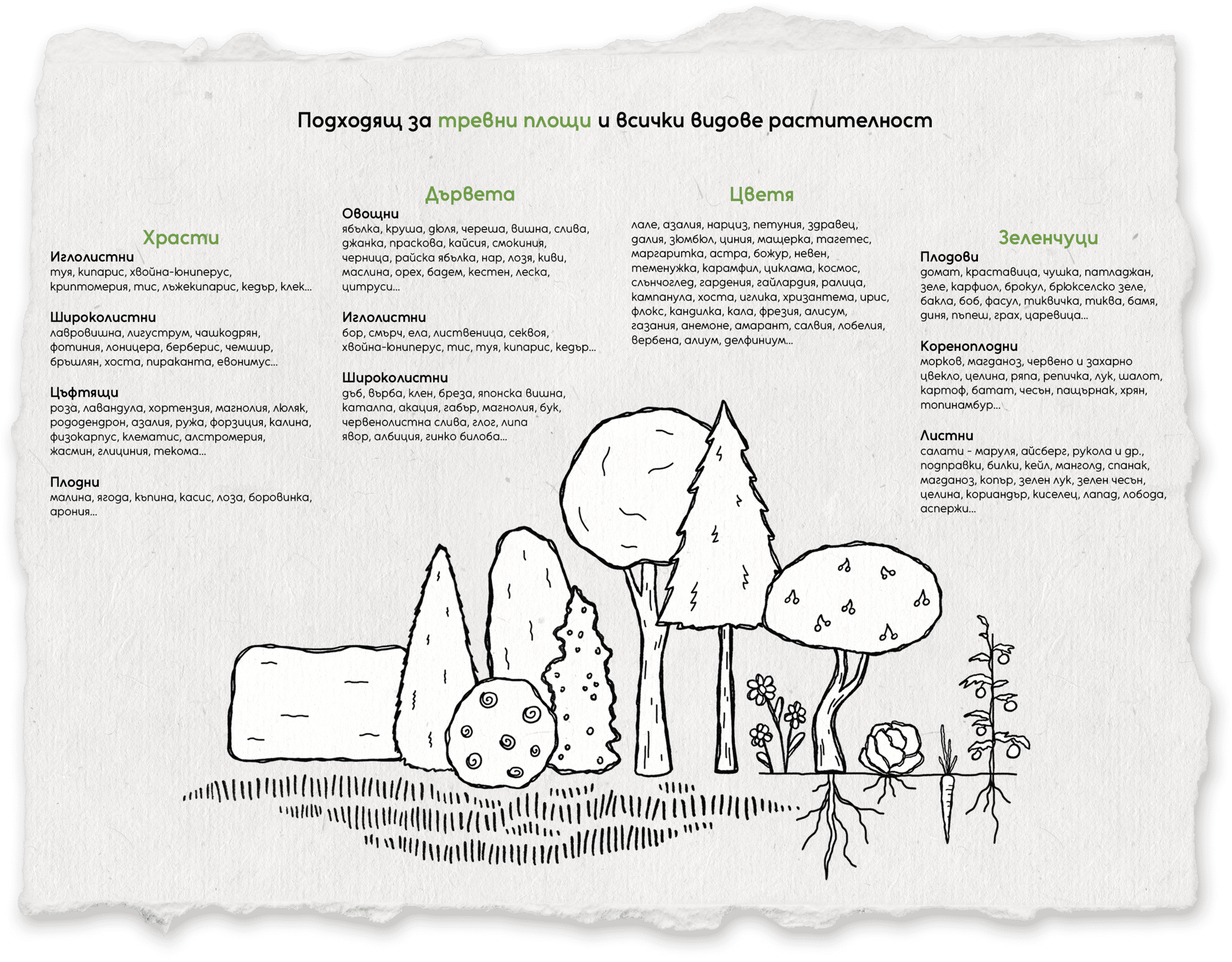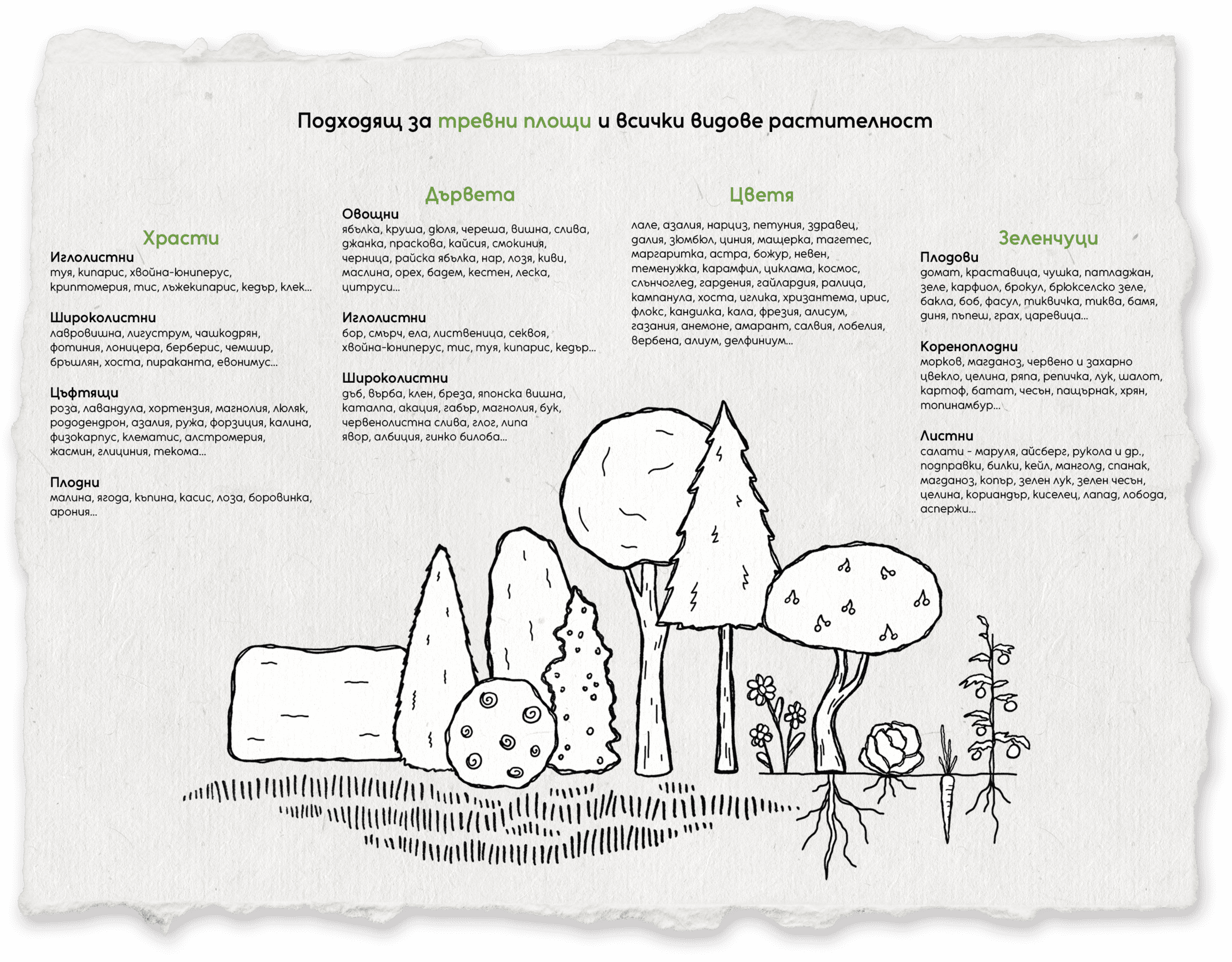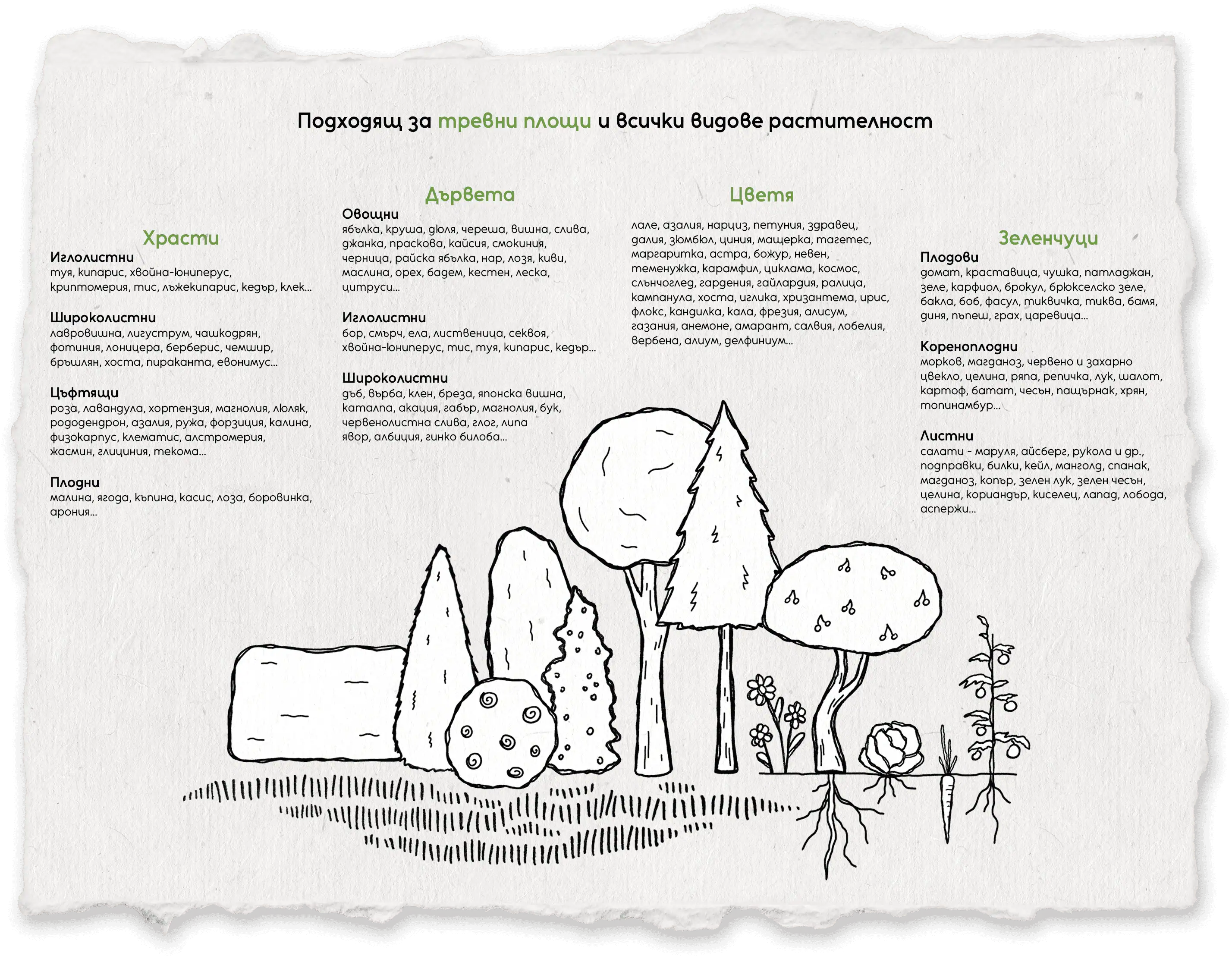 Предназначен е за чисти, екологични зеленчукови и декоративни градини.